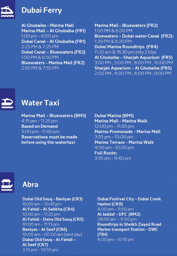 The trip from Al Ghubaiba to Dubai Marina appears to have been missed from this graphic but as it shows the ferry going from Bluewaters to the Marina we assume that this is also working on standard operating hours.