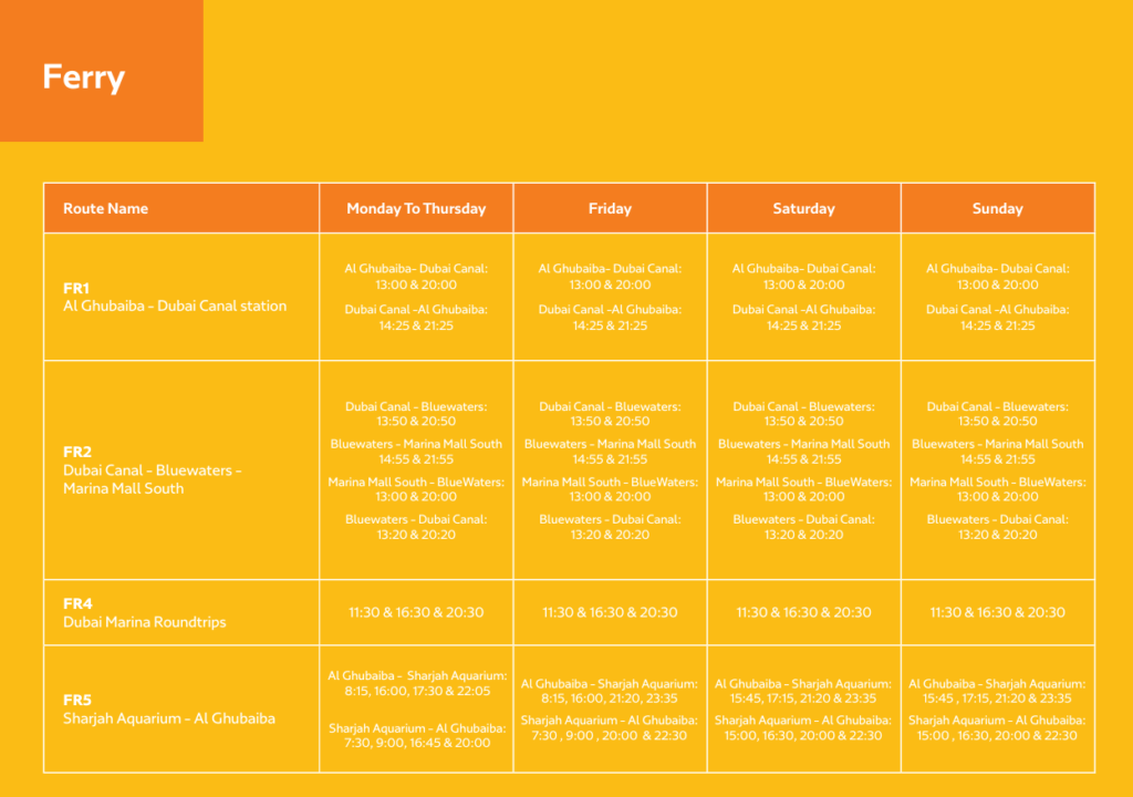 The timings for the Dubai Ferry do tend to change during Ramadan where the timings for Dubai Metro stay the same, so please note the timings as follows: